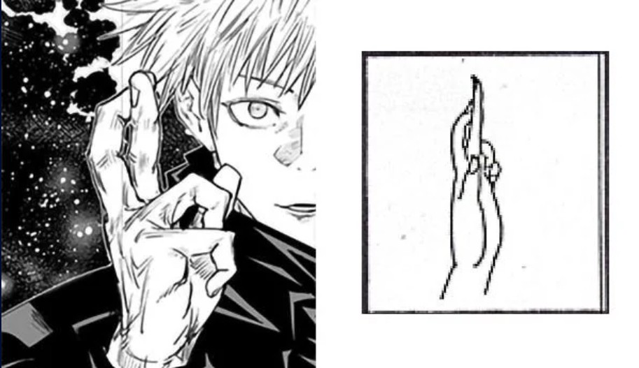 - Palec wskazujący zahacza o palec środkowy - u Gojo pozycja tych palców jest zamieniona.